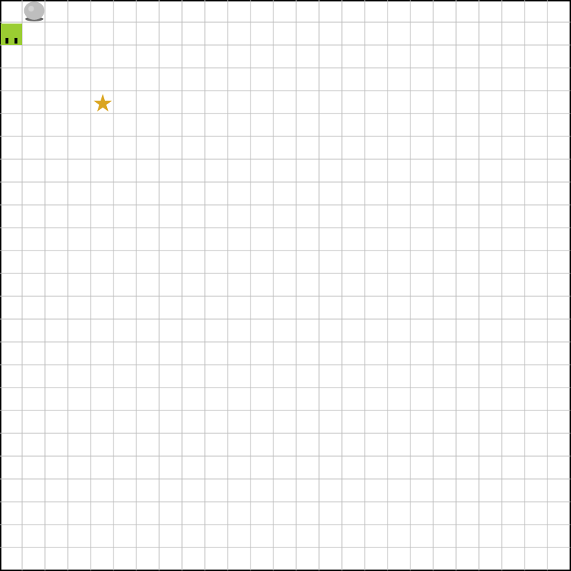 In this game, you control a snake (green squares) that wanders around a grid (square) board controlled using the arrow keys on your keyboard, eating food morsels (the gold stars), and avoiding obstacles (the gray stones).